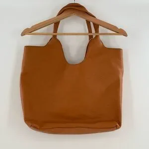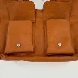 Stylish and versatile tan leather tote bag, perfect for any occasion. Features a spacious interior and secure front pockets.