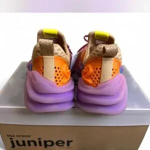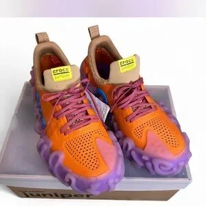 Bold orange upper with purple accents. Unique design with comfort fit. Perfect for active wear.