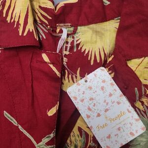 Bold red romper with yellow and green floral design. Features a button-up front.