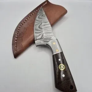 Discover the elegance of this 6" total length/ 3" blade handcrafted Damascus steel skinner knife, featuring a striking brown handle with a full tang. Perfect for collectors and outdoor enthusiasts. Comes with leather sheath w/ beltloop.