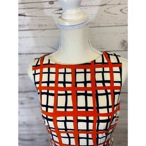 Beautiful polyester and spandex dress in white orange and navy large checks. Round neck fitted at the waist with a A-line skirt that is a midi length. Zipper. Excellent condition