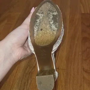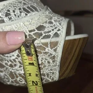 Jessica Simpson white lace platforms with wood heel & platform. White leather trim throughout. Extremely sexy and perfect foe a young bride or engagement party! 💍