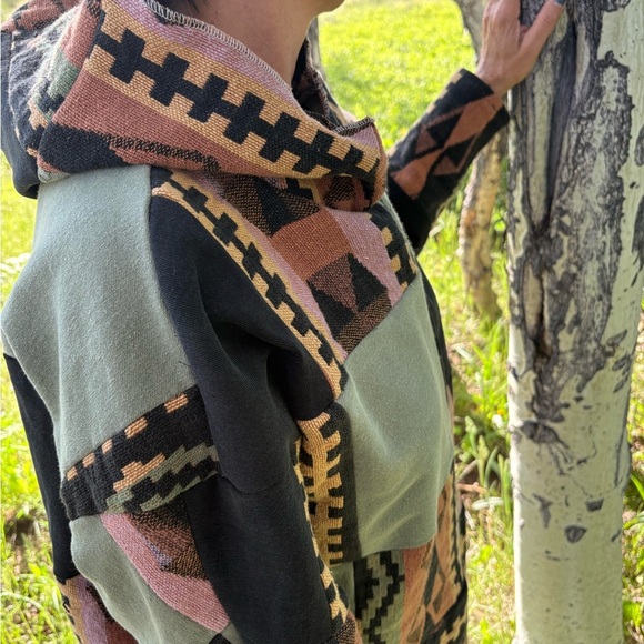 Lots of love went into making g this up-cycled blanket- jeans hoodie. The blanket and the jeans were purchased at a local thrift store and given new life in the item.