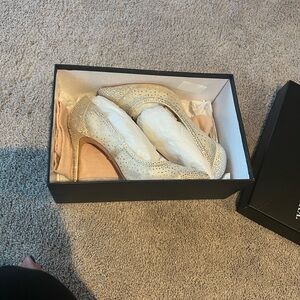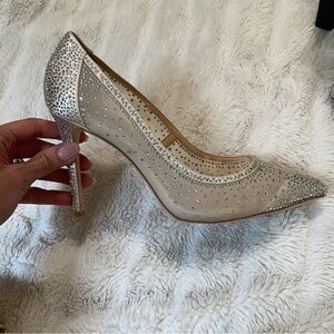 Stunning Badgley Mischka heels with shimmering crystal accents. Ideal for elegant events or your wedding. Pictures truly don’t do these justice. I bought 2 pairs of shoes for my wedding and walked down the aisle practicing in both but ended up going with the other blush pair I bought. These are a showstopper though!!! Comes with dust bag extra heel tips and crystals. Only walked in for about 15 minutes!!