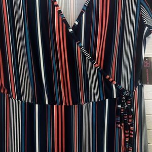 Chic asymmetrical dress with bold stripes. Features a wrap design. Ideal for casual outings. Size XXXL junior