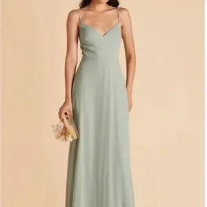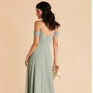 Chic sage green maxi dress by Birdy Grey. Off-shoulder style with a graceful flow. Off the shoulder straps are removable. Dress length was shortened by a few inches. I am 5’1 and wore 4 inch heels. Worn only once and is in excellent condition!