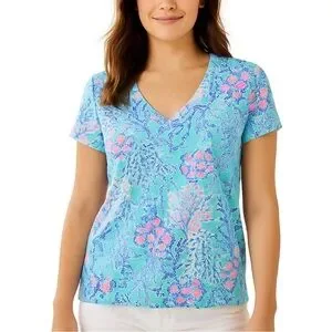 Bring a splash of coastal charm to your wardrobe with this Lilly Pulitzer Etta V-Neck Tee in the vibrant Blue Ibiza “Now You Sea Me” print. Crafted from 100% cotton, this lightweight and breathable tee offers a relaxed fit with short sleeves and a flattering V-neckline. The playful coral reef and floral-inspired pattern in shades of aqua, blue, pink, and lavender adds a whimsical, beach-ready vibe. Perfect for pairing with shorts, skirts, or casual pants for effortless resort style.