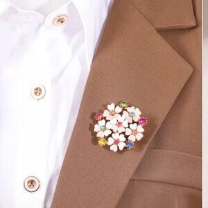 Sweet vintage style brooch featuring a cluster of white flowers with multicolor crystals. Gold alloy, pin backing. Free of lead, nickel, cadmium.