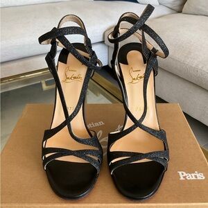 Authentic Christian Louboutin Audrey Strappy Black Glitter Sandal, size 39.5, in excellent condition! Only worn once. Only two tiny flaws: white mark on the back of left heel, and on heel ankle strap, a tiny bit of thread is visible, see pics.