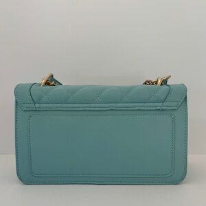 Chic teal clutch with gold accents. Quilted design. Perfect for elegant outings.