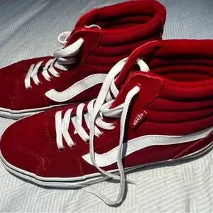 Vibrant red Vans high-top sneakers. Features white laces and iconic side stripe.
