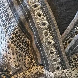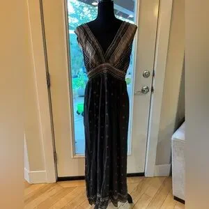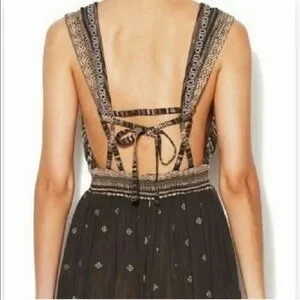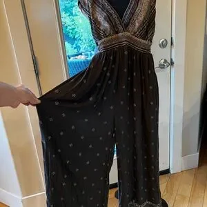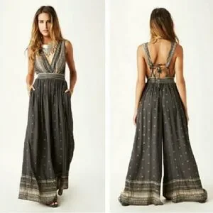 Free People's, Size XS Deep V Romper boasts embroidered and beaded details and a flowing wide leg silhouette that mimics a maxi skirt.