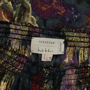 Elevate your boho style with this Artelier by Nicole Miller floral blouse, crafted in luxurious silk chiffon with shimmering gold metallic accents. Features a smocked neckline that can be worn on or off the shoulders, adding versatility to your look.