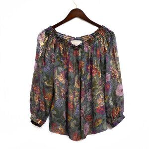 Nicole Miller Artelier M Silk Floral Boho Top Gold Metallic Off-Shoulder Blouse