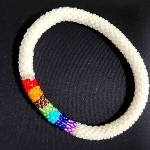 Vibrant beaded bracelet with a mix of colors including white, blue, purple, green, brown, and red.