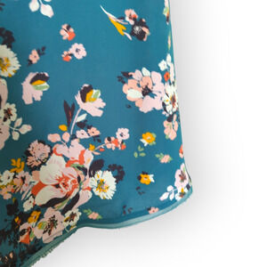 This dressy slightly sheer teal v-neck tank top has a pink, white, and orange floral design.