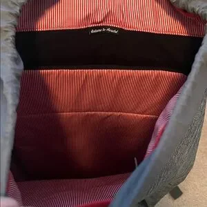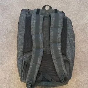 Charcoal backpack with black straps. Features front pocket and top flap closure. Ideal for everyday use.