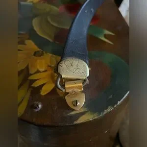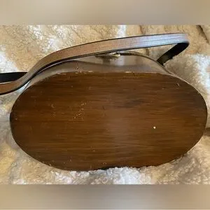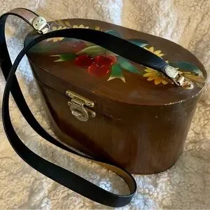 Beautiful Vintage wooden bag featuring hand-painted flowers and fruit. Rich brown with vibrant red, green, and yellow accents.