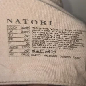 Elegant Natori blush pink balconette bra in size 34DD. Features soft scalloped lace overlay, lightly lined cups for shape, supportive underwire, and adjustable straps for a custom fit. Hook-and-eye back closure. Romantic, feminine style perfect for everyday wear or special occasions. Excellent pre-owned condition—lace is clean and intact, straps and closures fully functional.
