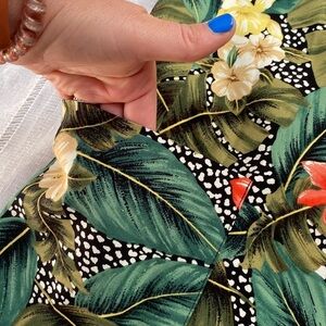 Liz Claiborne vintage botanical blazer. Size 8P. Such a stunner! Gorgeous greens with a pop of red and yellow. Pearl button closure in the front and at the end of each sleeve. This is an eye catching blazer that you can dress down with denim or up with a little black dress or wide leg trousers. Incredible condition too!
