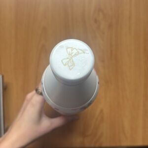 Charming water bottle with pink floral pattern. Features Stanley branding.