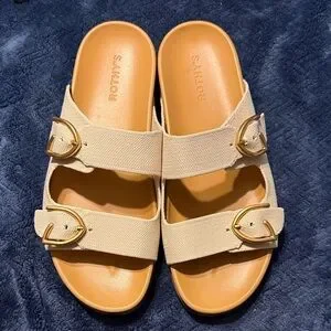 Chic and comfortable Rothy's slide sandals. Features stylish gold buckles. Ideal for casual wear.