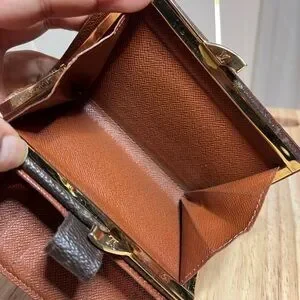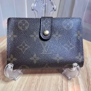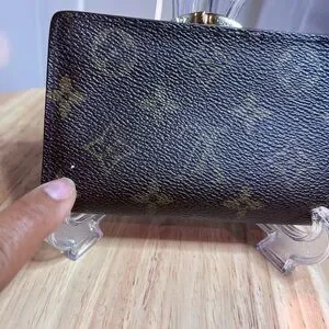 Elegant wallet with classic monogram pattern. Features a secure snap button. Snap works well.