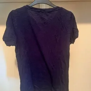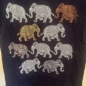 Navy short sleeve tee. Features elephant design in silver, gold, and brown.