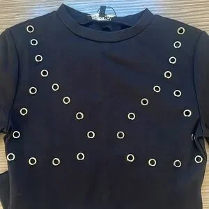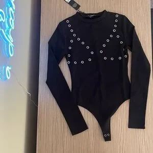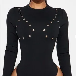 Fashion Nova XS Black Long Sleeve Bodysuit w/silver grommet detail front and back. NWT