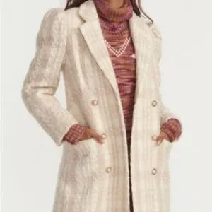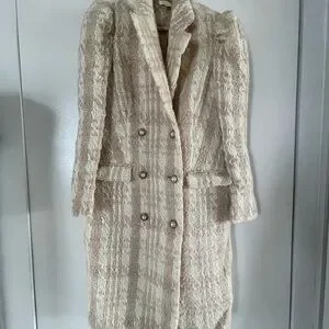 Chic cream teddy jacket with a textured design. Features a stylish double-breasted front. Perfect for layering. Tweed wool