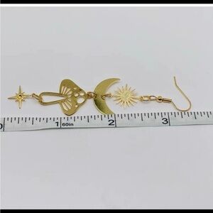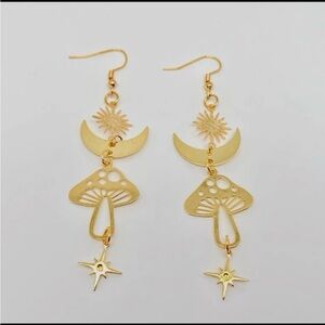 Elegant gold dangle earrings featuring a whimsical mushroom design. Perfect for adding a touch of charm to any outfit.