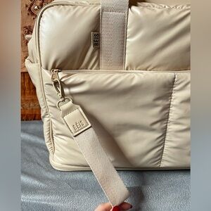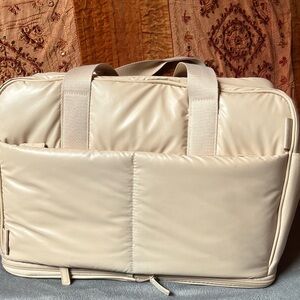 This bag expands at the bottom with a zip closure to allow for more storage, has a laptop sleeve , and a wet compartment, 2 water bottle pockets on the outside, and 2 very large front pockets, one can double as a trolley pass through. Never use this anymore - still very new and great condition! Slight tear on the inside, not noticeable and doesn’t affect functionality of the bag.