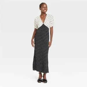 Chic maxi dress with polka dots. Features a stylish black and white design. Ideal for versatile wear.