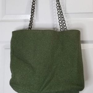 Goldie purse embellished with a pink stripes bow and chain link handles. Vintage green tweed fabric with black inner lining. Measures approximately 10in. H, 13in. L, 5in. W