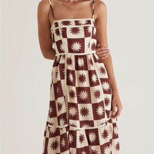 Chic midi dress with sunburst pattern. Features brown and cream colors. Ideal for stylish outings.