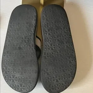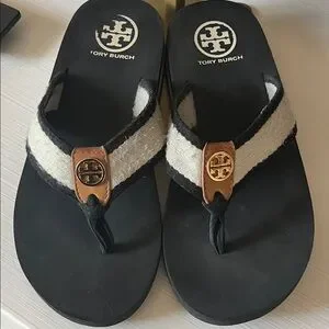 Elegant flip flops with a gold logo detail. Features black and cream straps. Good used shape.