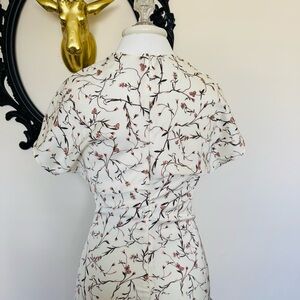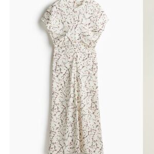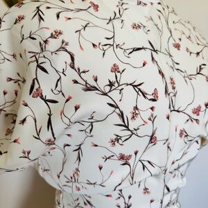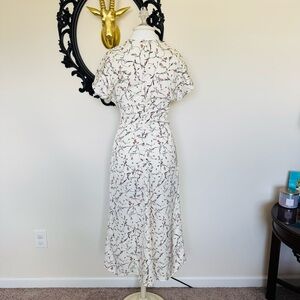 This dress is new without tags- only worn to try on and could not return. It’s a white midi/calf length dress with a light pink floral print. It has a round neckline with a concealed zipper with hook and eye fastener. It has short flowy sleeves with a tapered waist and a softly draped skirt. It’s unlined. It’s a size extra small. On a flat lay, these measurements are approx: waist 13” and length 50”. This is sold out online.