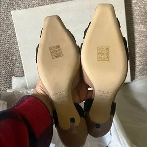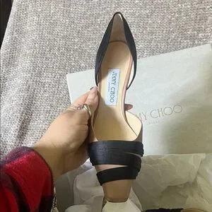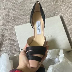 Chic Jimmy Choo Lyrin 85 Ballet Pink heels with a black and ballet pink design. Perfect for stylish outings. Full set NWT comes with dust bags and box.