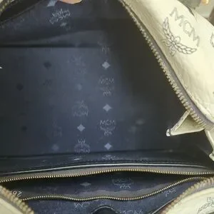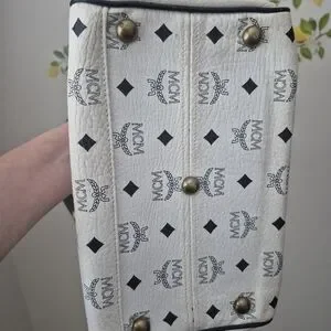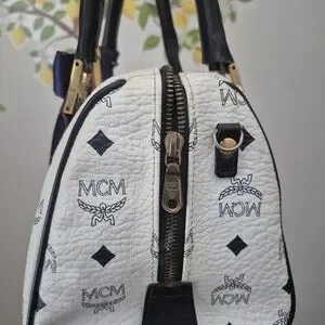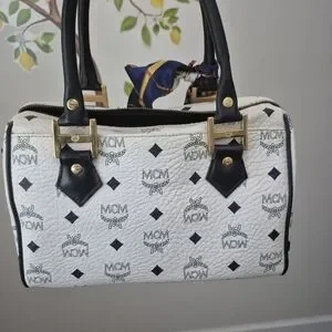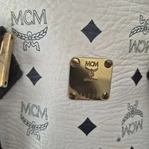 MCM in Navy/White. Clean inside and out. Includes silk bow that can be removed. Also, a gold chain that can be worn as an over the shoulder or cross body.