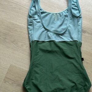 Jule Dancewear Leotard. Stylish two-tone green and light blue leotard . Perfect for ballet/dance class. In good condition, slight discoloration on inside of bust longing but not noticeable during wear.