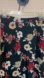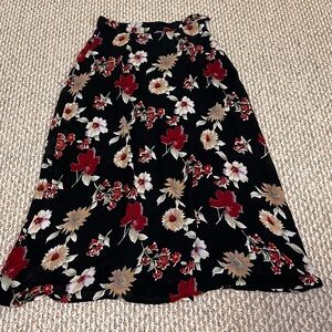 Chic black midi skirt with bold floral design. Side zipper and button closure. Lined. No size or material tag but fits like a XS / Size 2 and material is a thin flowy polyester. Adorable! I’d style it grungy with some black boots!