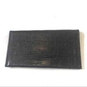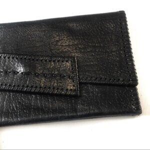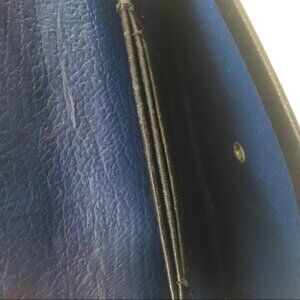 Super cute I love the inner blue colorBlack embossed leather like clutchLooks and feels like leather Im not sure if its genuine leatherWith stitching detailsVery neutral it can compliment many colorsGreat condition with fading areas here and thereClean and in very good shape