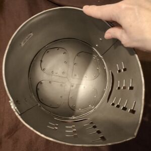 Medieval Style Full Face Steel Knight Helmet. Perfect for Halloween or Cosplay. Renaissance festival. 15" tall. 9.5" wide. Comfy and breathable. 5 pounds, 10 ounces. Additional shipping applies. Made in India.