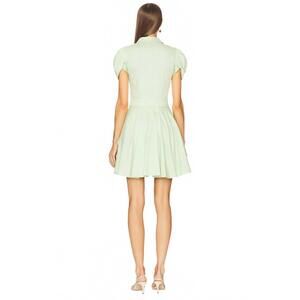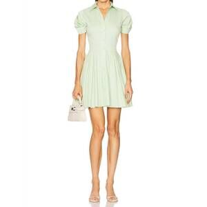 Elevate your spring wardrobe with the April Dress by ALEXIS, embodying minimalist elegance in mint. This mini dress showcases short sleeves and a fit-and-flare silhouette crafted from a solid 53% Cotton, 43% Viscose, 4% Elastane blend. Designed with a tailored button-down bodice, ruched sleeves, and a pleated skirt, it promises sophistication for any holiday party. Originating from China, it features a convenient button closure, pockets, and recommends dry cleaning for best care.