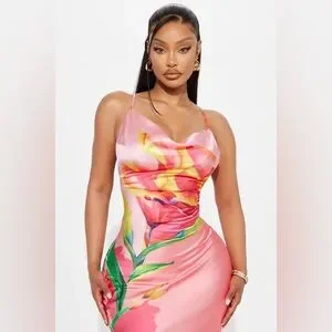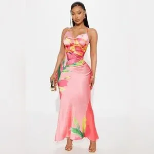 Fashion Nova Amora Floral Satin Maxi Dress - Coral/combo XS