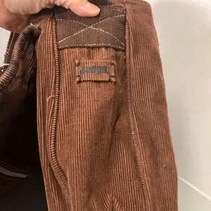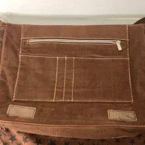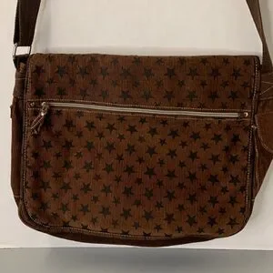 Well made Brown Corduroy Messenger bag with star pattern. Ideal for daily use. Features adjustable strap and front zipper pocket. In excellent condition. Great for college or school bags and computer.