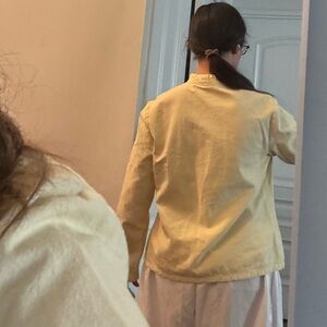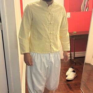 Men’s (or unisex) cream shirt/jacket with Asian inspiration from Chinese frog-button tradition. Was worn as in a Broadway production.