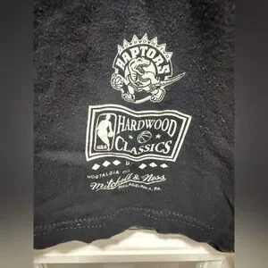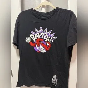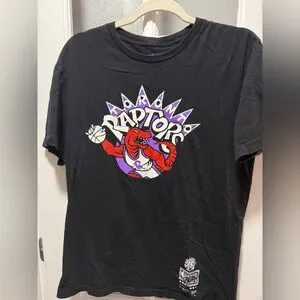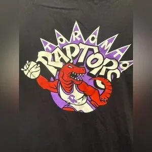 Black short sleeve tee with Toronto Raptors graphic. Features red and purple accents.