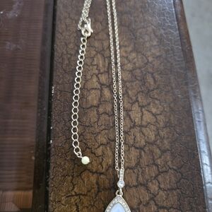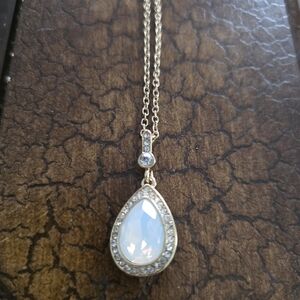 Chic gold necklace with a white teardrop pendant. Sparkling accents enhance its elegance.