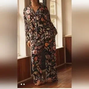 Stylish pajama set with a vibrant floral print. Features a button-up top and matching pants. Perfect for a cozy night in ( exlarge top medium pant.